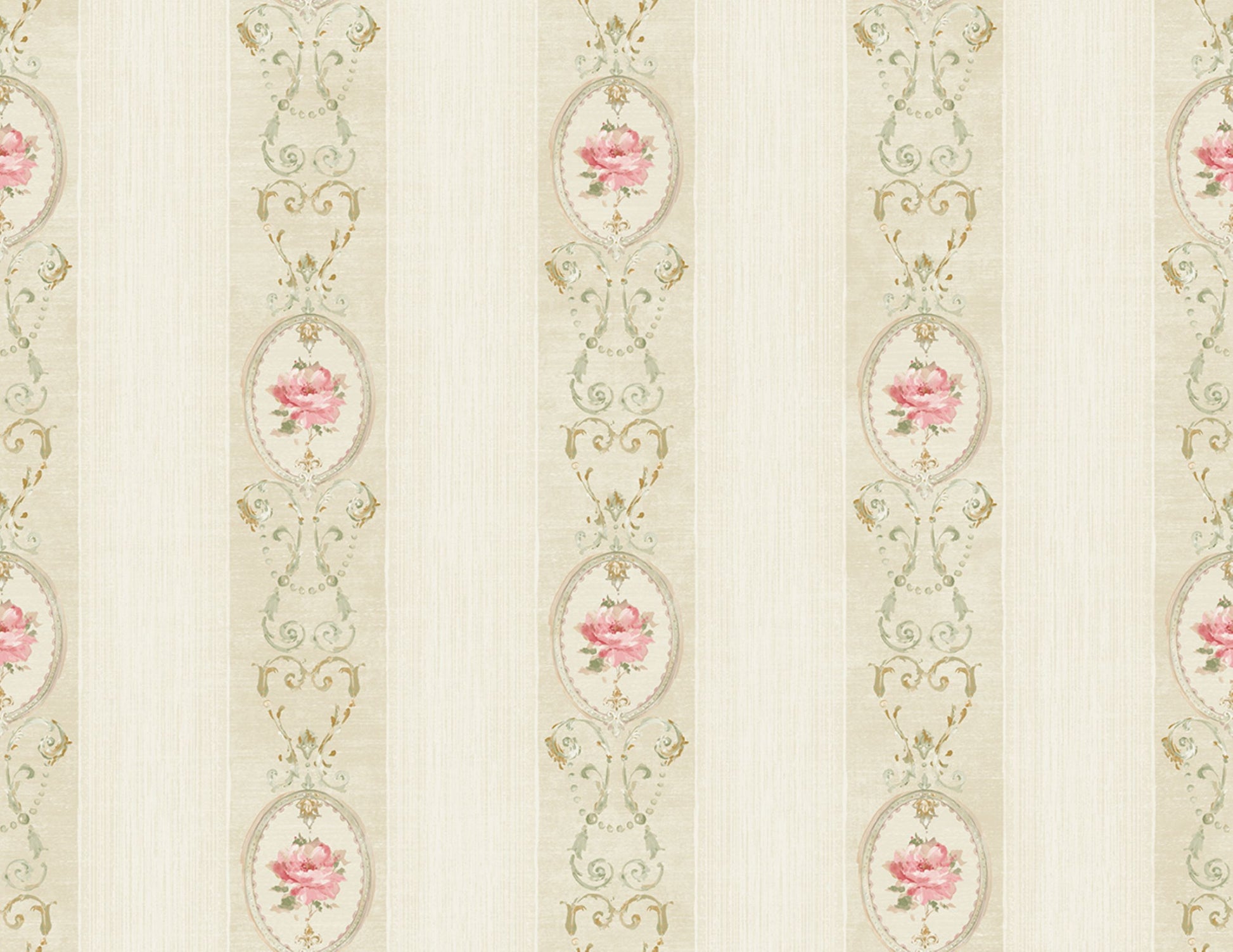This design beautifully showcases florals between stripes. Blooming roses are depicted using an expressive, painterly technique in this floral wallpaper pattern. The subtle faux backdrop mimics the style of the foreground element to develop a cohesive look. Capturing the essence of the French countryside, this design will add a touch of elegance to your wall surfaces.